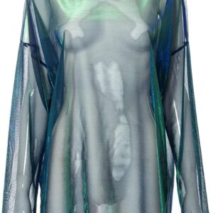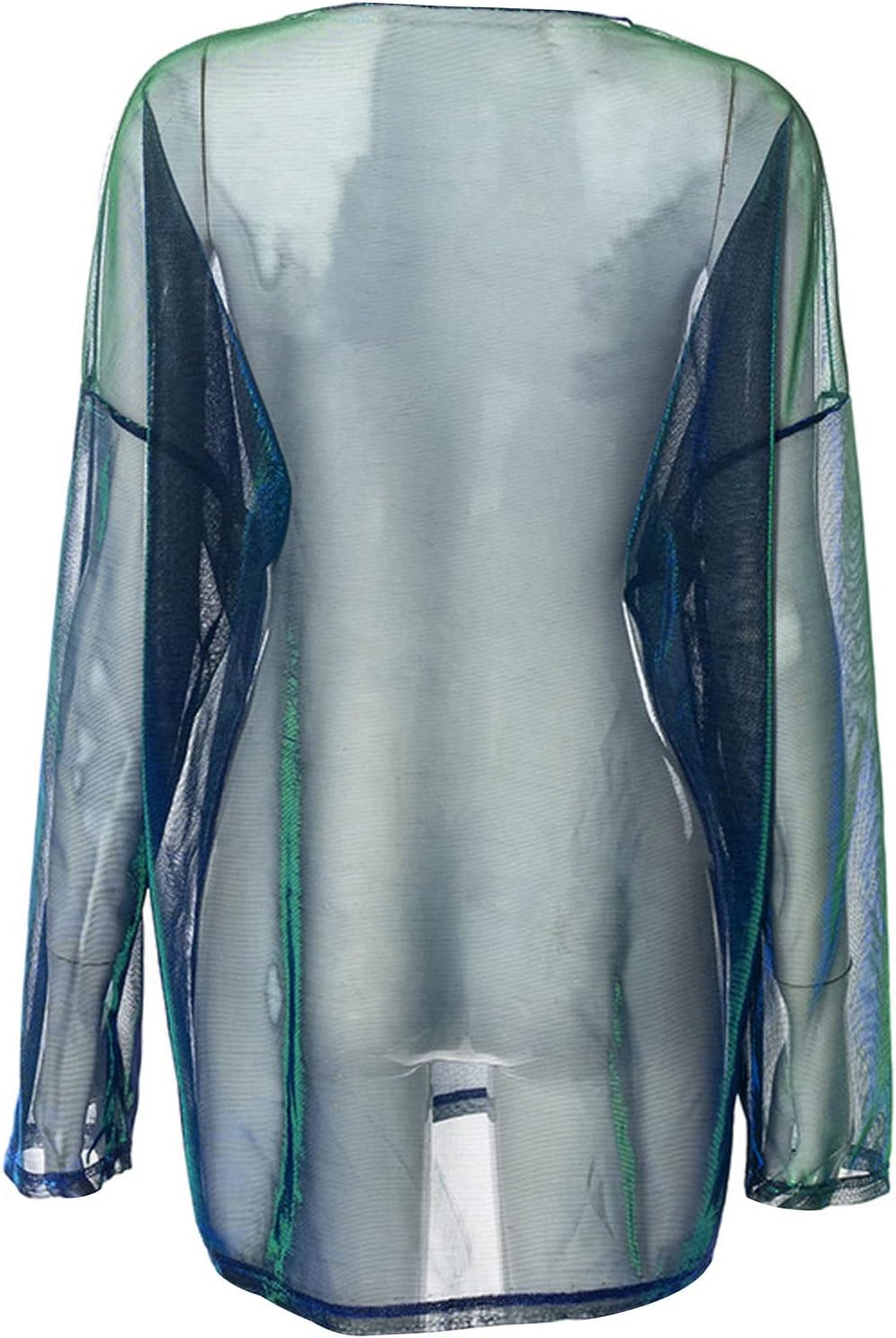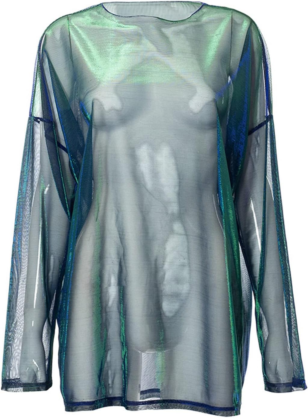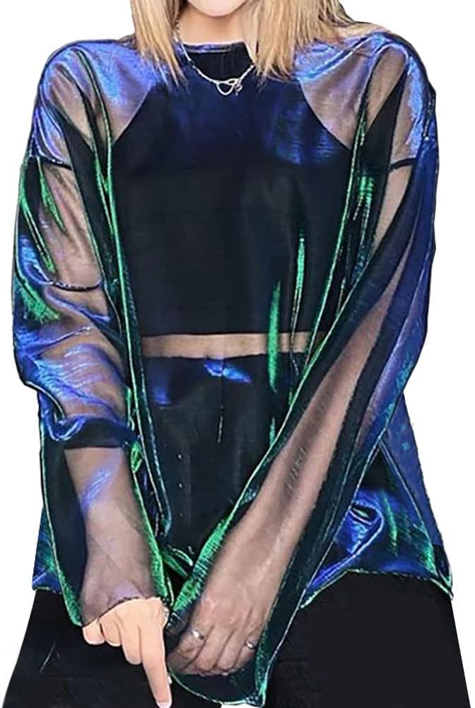 Women See-Thru Sparkly Cover Up Tops E-Girls Metallic Shiny Oversized Tee Shirts